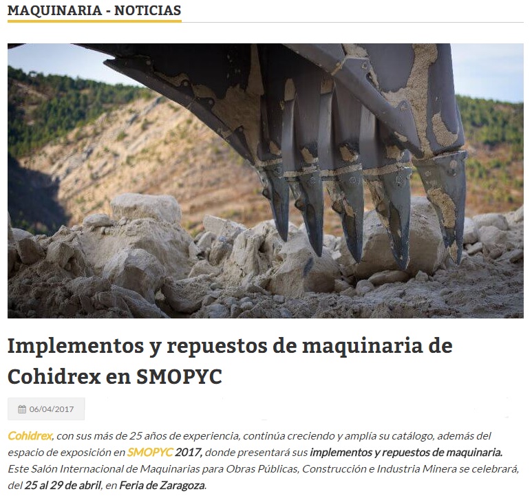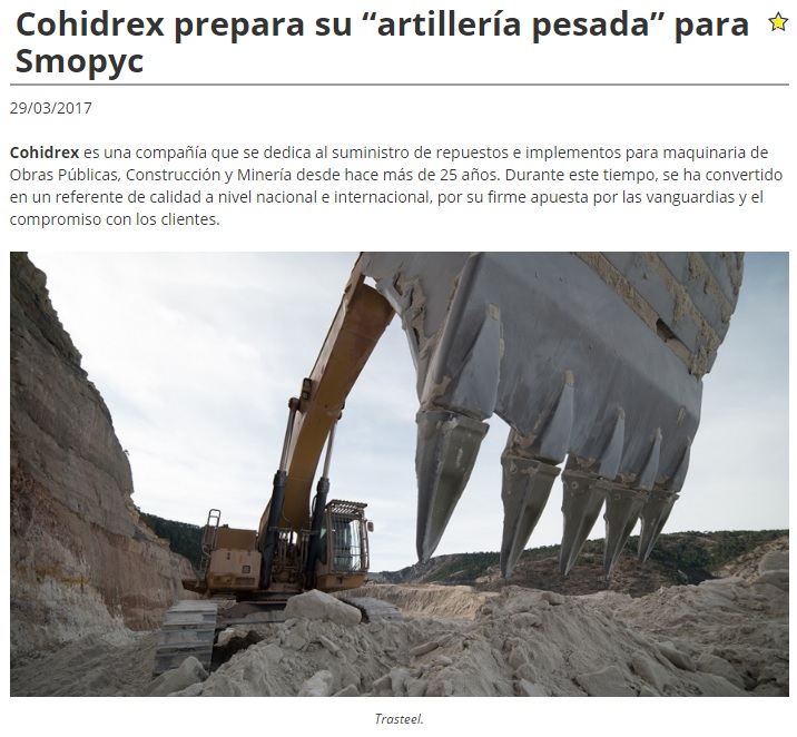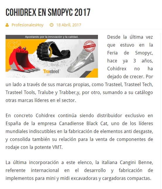 Lo sabe todo el mundo ya! Estaremos en el Pabellón 6 stand 6-10 con nuestra gama de dientes para excavadora Trasteel, implementos Cangini Benne, cadenas y tren de rodaje Trabber...Y los nuevos martillos hidráulicos Trasteel tech! Si quieres saber más, lee lo que la prensa especializada dice sobre nosotros...