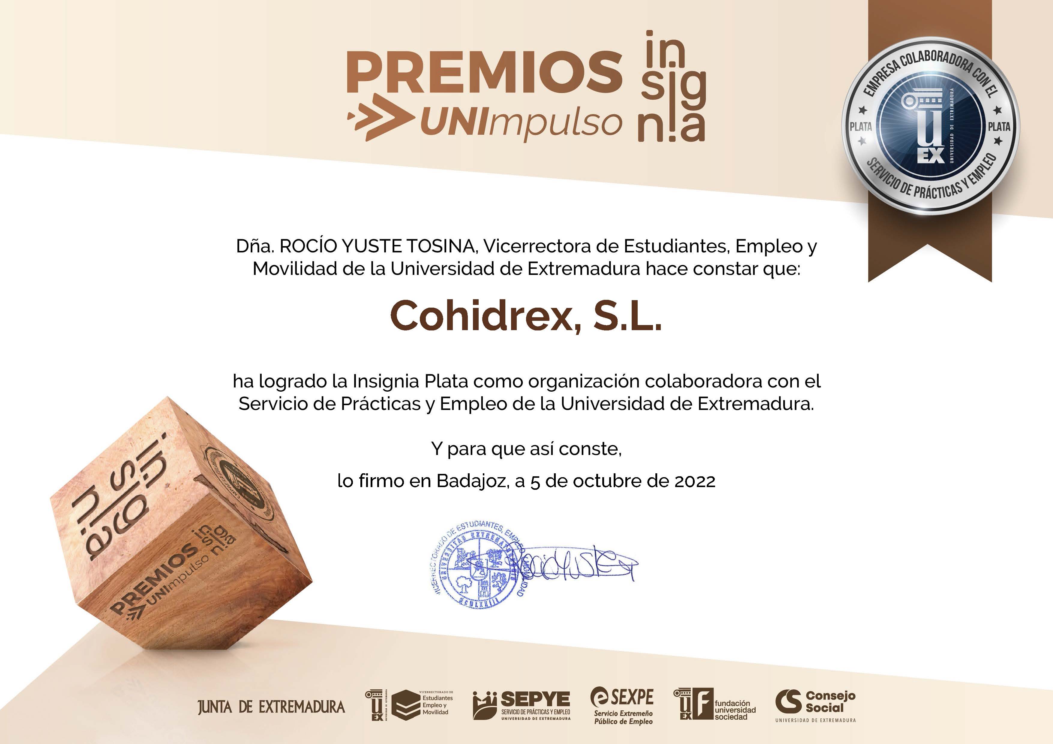 Cohidrex ha obtenido la insignia plata por su colaboración con el Servicio de Prácticas y Empleo de la Universidad de Extremadura.