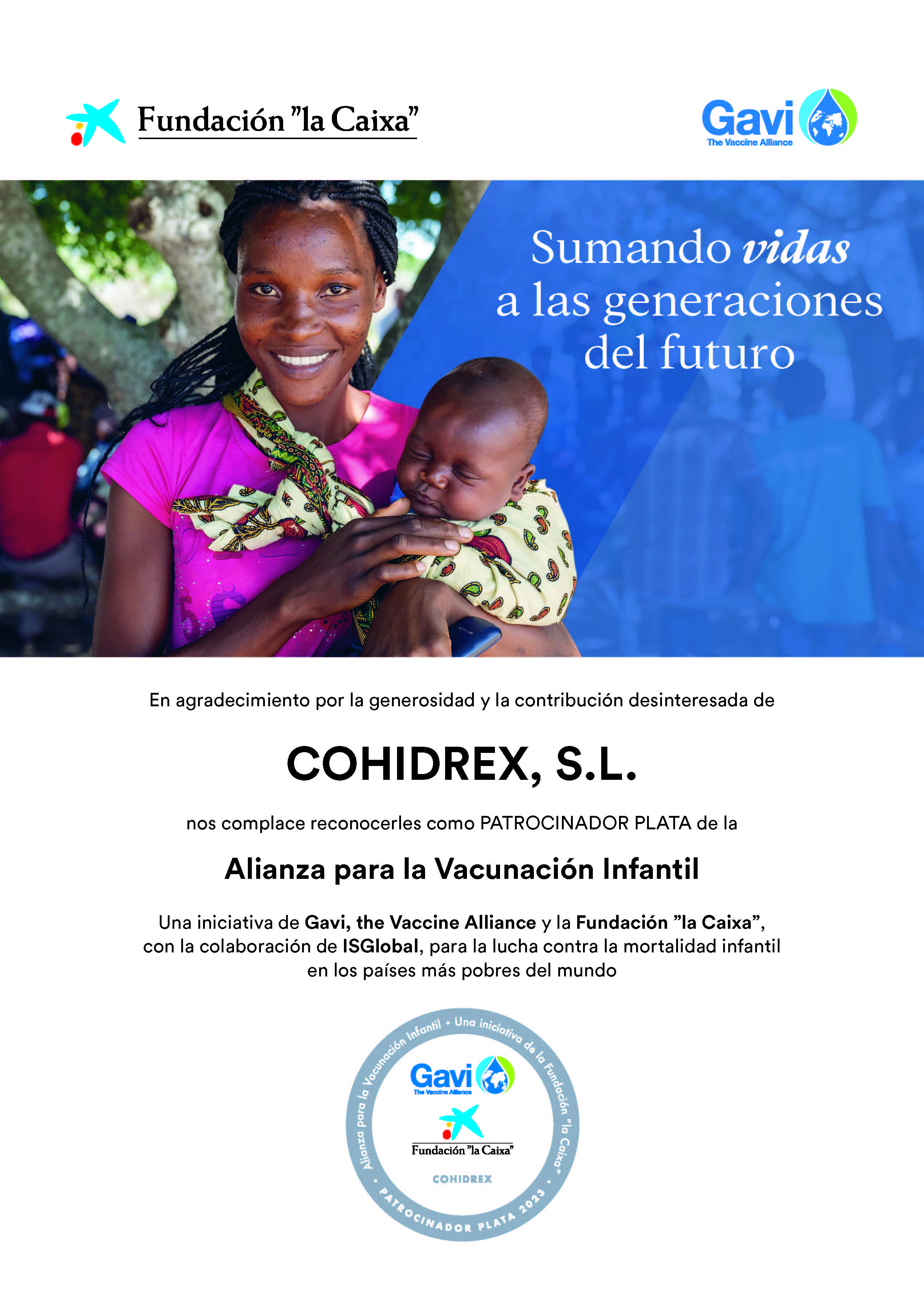 Cohidrex obtiene el distintivo de Patrocinador Plata de la Alianza para la Vacunación Infantil, fruto del donativo realizado por la compañía a la organización internacional Gavi, the Vaccine Alliance y la Fundación "la Caixa", para la lucha contra la mortalidad infantil en los países más pobres del mundo.
